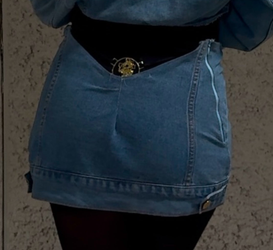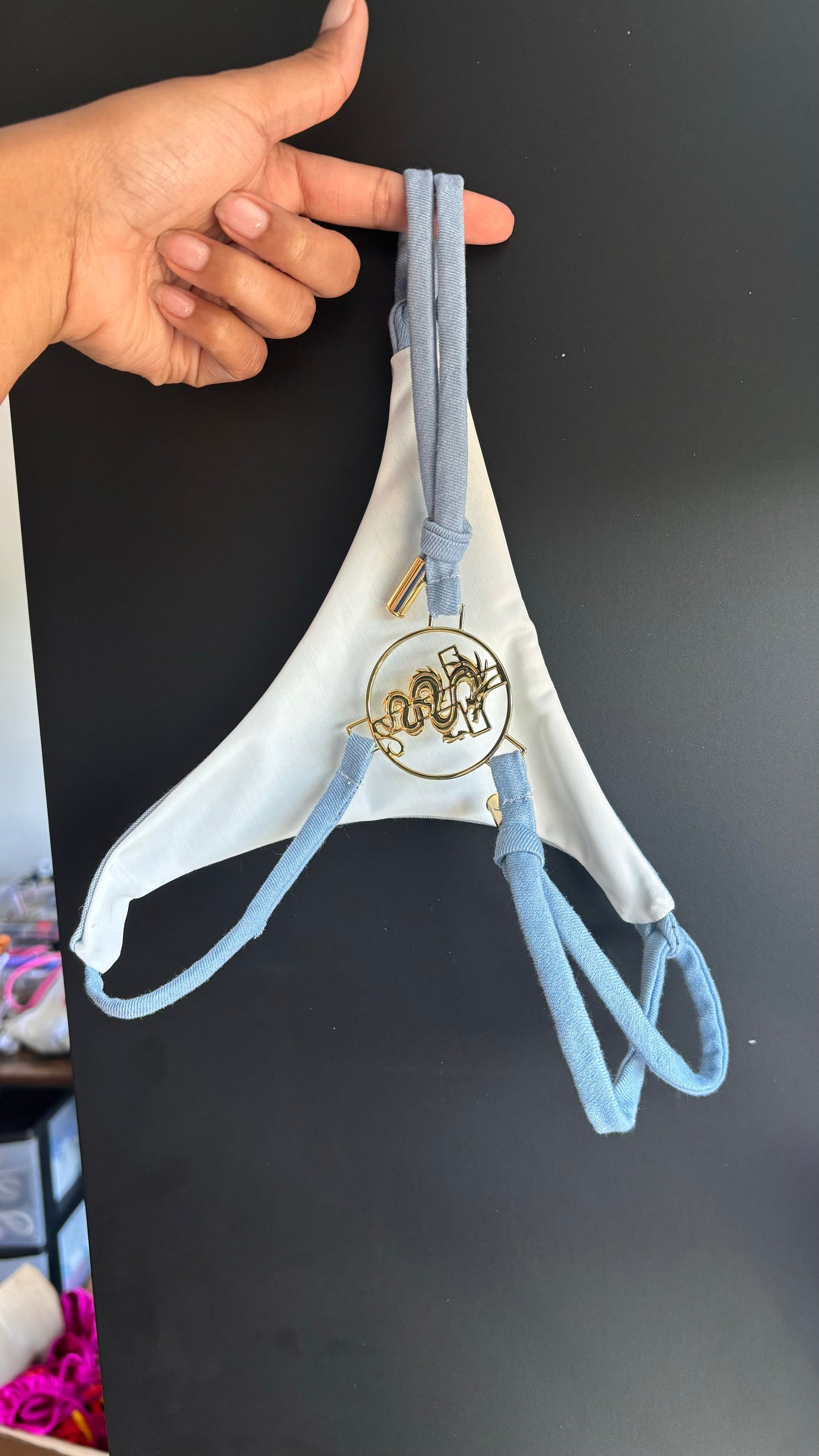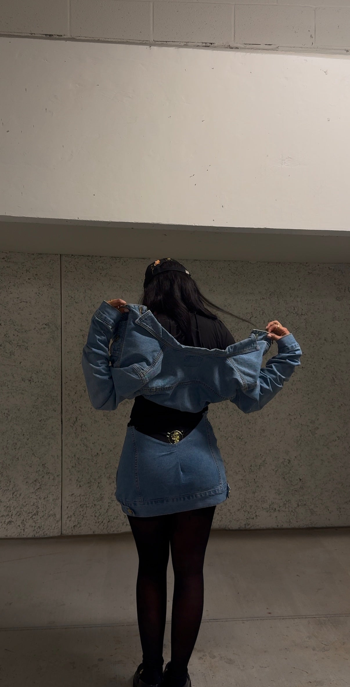 This light-wash denim three-piece set is the ultimate blend of bold and tasteful design. The cropped jacket offers a structured, non-stretch fit with gold accent logo buttons, making it perfect as a stylish top or layering piece. The mini skirt features a standout waistline design, with a low-cut symmetry in the front and a low-rise V cut in the back, perfectly showcasing the included signature medallion G-string. Together, these pieces create a cohesive look that celebrates edgy sophistication, with functional pockets and intricate details that make every element a statement.