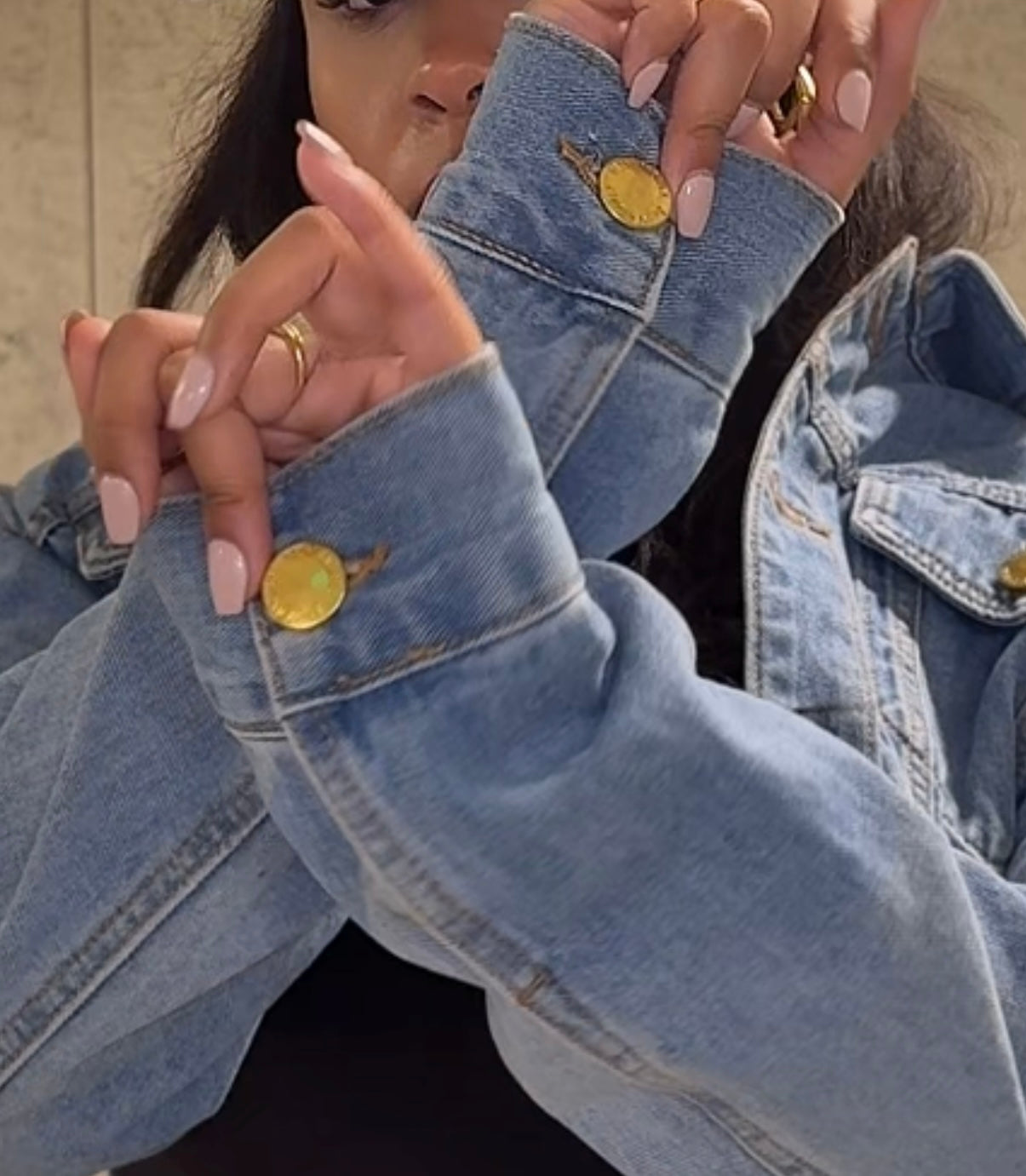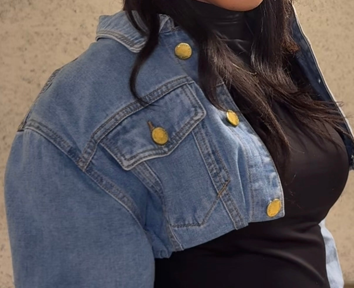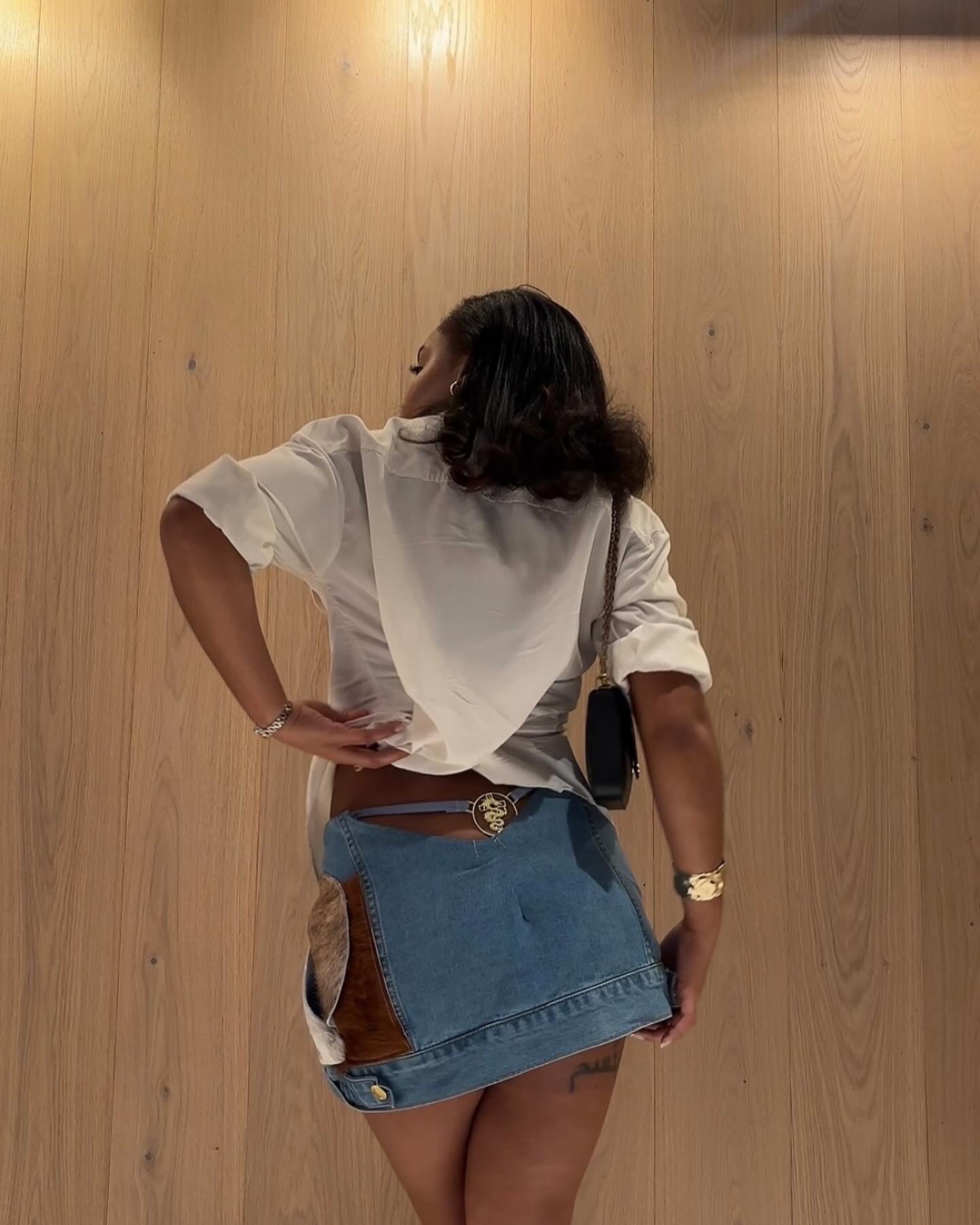 This light-wash denim three-piece set is the ultimate blend of bold and tasteful design. The cropped jacket offers a structured, non-stretch fit with gold accent logo buttons, making it perfect as a stylish top or layering piece. The mini skirt features a standout waistline design, with a low-cut symmetry in the front and a low-rise V cut in the back, perfectly showcasing the included signature medallion G-string. Together, these pieces create a cohesive look that celebrates edgy sophistication, with functional pockets and intricate details that make every element a statement.
