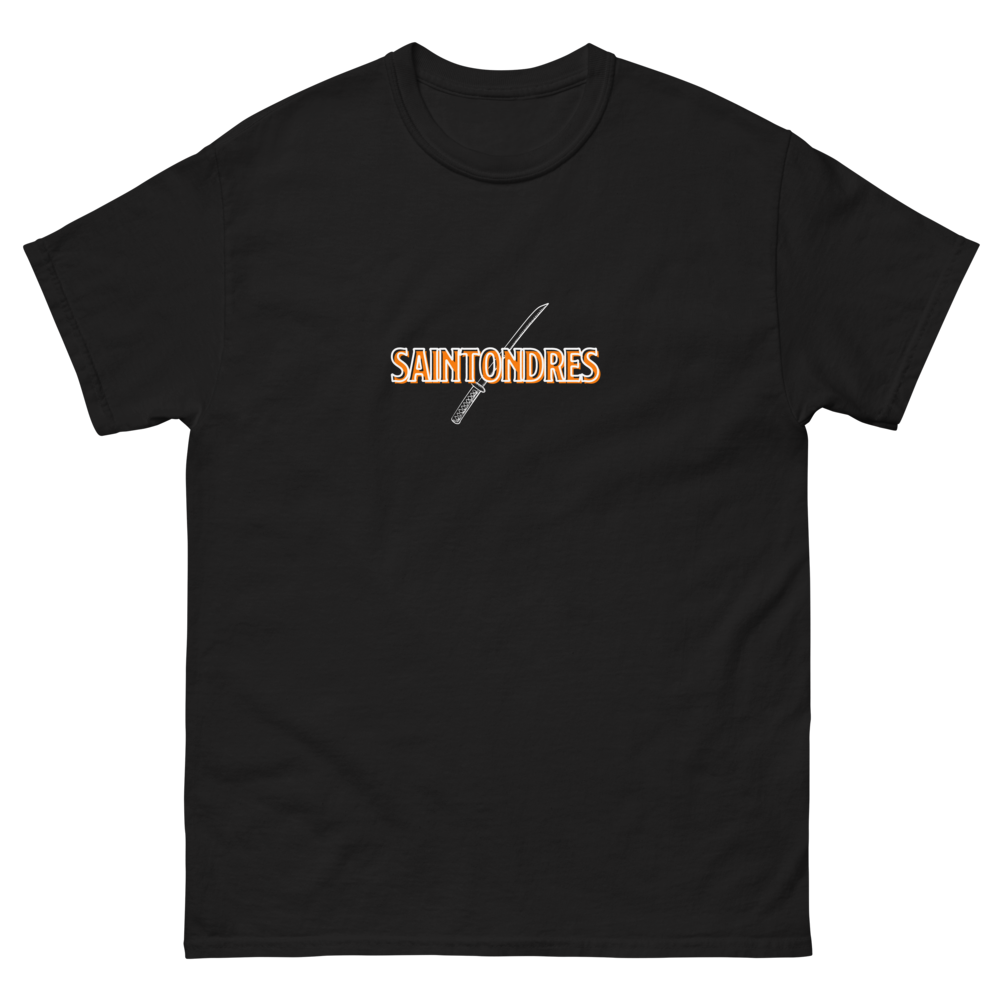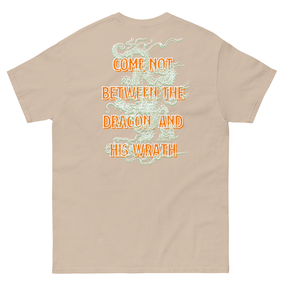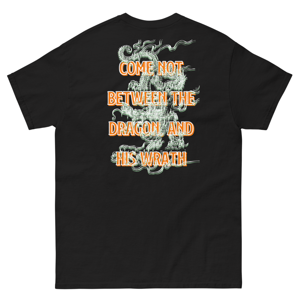 A Saint Ondres Tour signature design. Our XL graphics have become a signature for our brand as they pair perfectly with our signature SeeThru Denim Jacket. This design features the Shakespeare quote "Come not between a dragon and its wrath" in orange lettering, outlined in white.